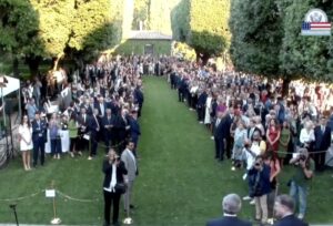 Parterre delle grandi occasioni, volute di fumo dai barbecue texani e una platea politica trasversale per il primo ricevimento dell’ambasciatore statunitense Tilman J. Fertitta in Italia. Villa Taverna, storica residenza dell’ambasciata Usa a Roma, ha ospitato, con due giorni di anticipo rispetto al the Day canonico, oltre duemila invitati per la celebrazione del 249° anniversario dell’Indipendenza americana. Un evento mondano e politico che segna anche il debutto ufficiale dell’era Trump 2 nei rapporti bilaterali con l’Italia.