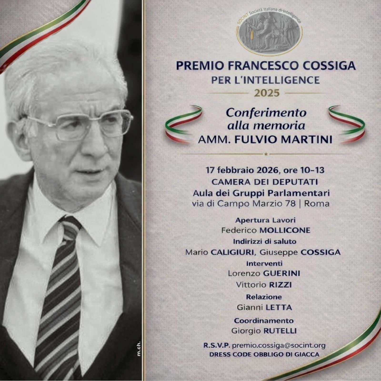 Martedì 17 febbraio 2025, alle ore 10.00, Roma ospiterà la VI edizione del Premio “Francesco Cossiga per l’Intelligence”, appuntamento ormai centrale nel panorama nazionale dedicato allo studio e alla valorizzazione della cultura dell’intelligence. L’iniziativa si terrà presso l’Aula dei Gruppi parlamentari della Camera dei Deputati, in via di Campo Marzio 78. Promosso dalla Società Italiana di Intelligence (SOCINT), il Premio è intitolato alla figura di Francesco Cossiga, presidente della Repubblica e profondo conoscitore delle dinamiche della sicurezza nazionale, e viene assegnato alla memoria dell’ammiraglio Fulvio Martini, già direttore del SISMI, protagonista di una stagione decisiva per l’intelligence italiana e interprete di una visione moderna, istituzionale e strategica del settore.
